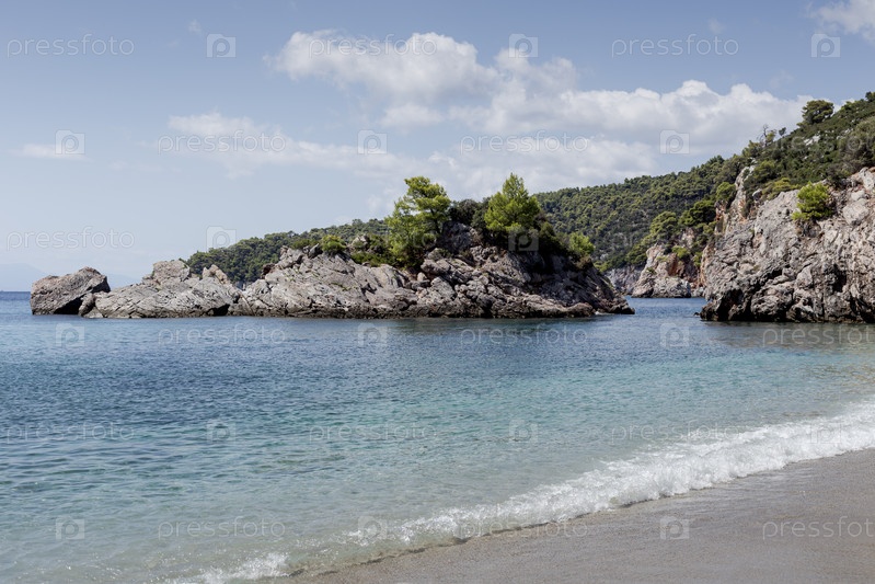 Вид на песчаный пляж, горы и море (Греция, остров Скопелос)