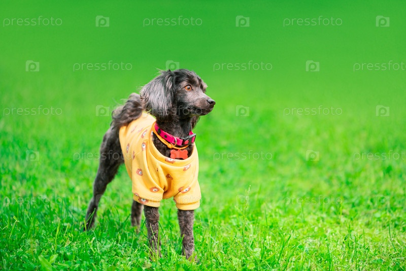 Маленькая пожилая собака в оранжево-жёлтом капюшоне и воротнике с костной меткой стоит на траве и отворачивается. Старый питомец в животных одеждах и розовый воротник, место для текста