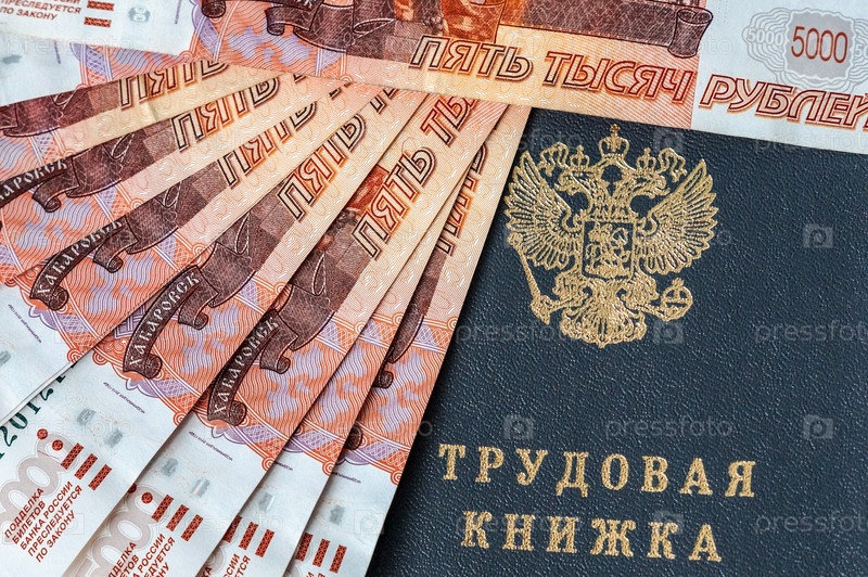 Книга трудоустройства и банкноты на пять тысяч долларов