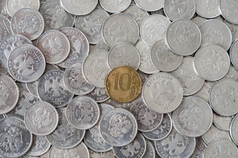 Золотая монета десять рублей в центре светлые монеты разных лет и деноминации, лежащий орел наверх