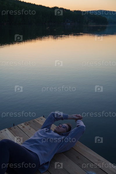 Женщина, лежащая на пирсе у озера, крупный портрет, летний закат