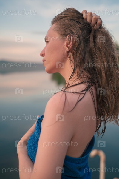 Молодая женщина с мокрыми волосами, завернутыми в голубое полотенце, стоит возле спокойного озера на закате солнца и со страстью смотрит вдаль
