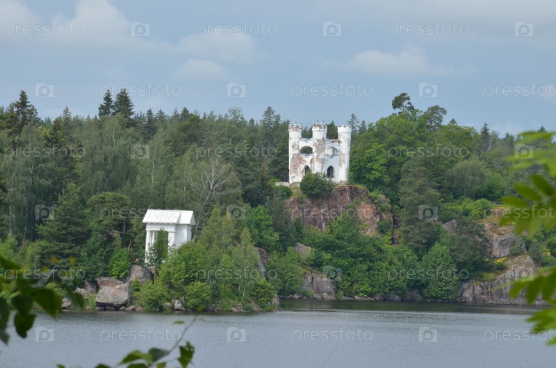 Вид на Капеллу Людвигсбурга на острове Людвигштейн и Храм Нептуна в Заливе защиты у особняка Монрепо недалеко от Выбора