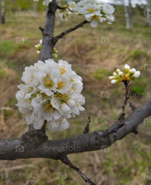 Одинокая слива в белом весеннем цвете на теплый майский день