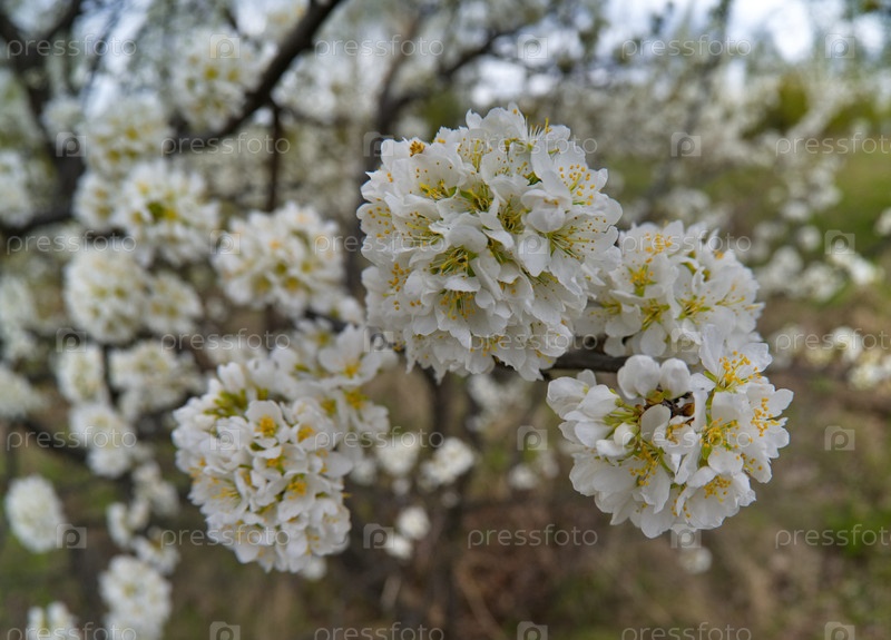 Одинокая слива в белом весеннем цвете на теплый майский день
