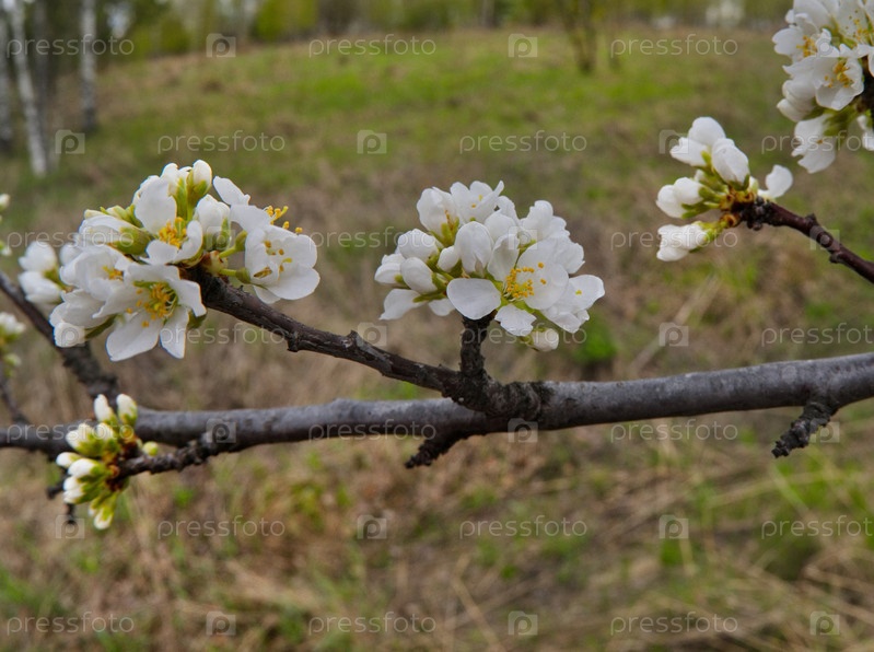 Одинокая слива в белом весеннем цвете на теплый майский день