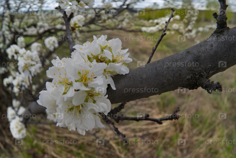Одинокая слива в белом весеннем цвете на теплый майский день