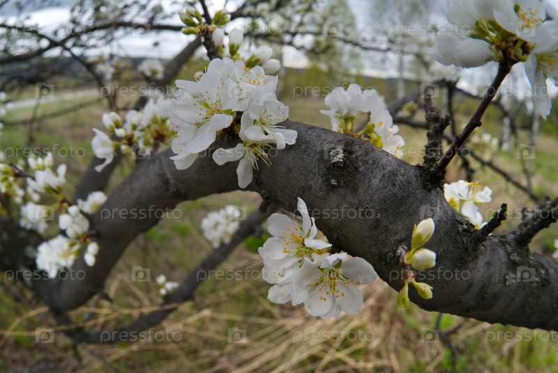 Одинокая слива в белом весеннем цвете на теплый майский день