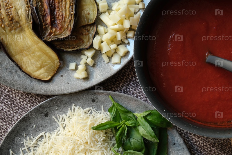 Ингредиенты для приготовления итальянской кухни Parmigiana di Melanzane: Пармезан, кубики моцареллы, базилик, томатный соус и баклажан