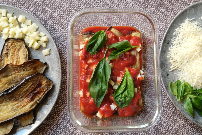 Этап приготовления Parmigiana di Melanzane с томатным соусом, сыром, базиликом и баклажанами