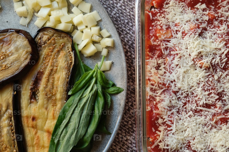 Этап приготовления Parmigiana di Melanzane с томатным соусом, сыром, базиликом и баклажанами