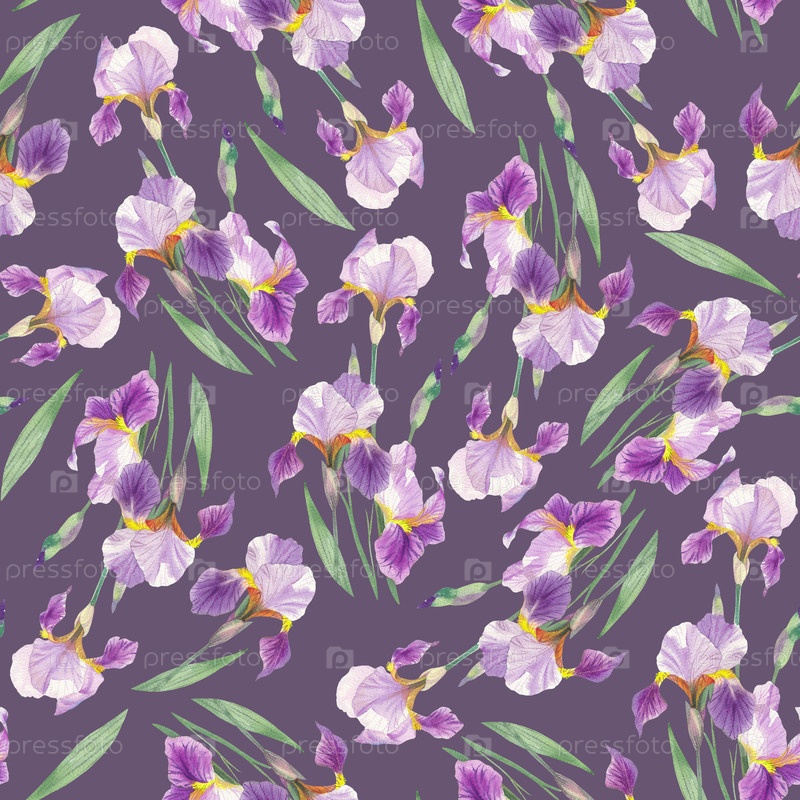 Бесшовный рисунок ирисов на фиолетовом фоне. Иллюстрация акварельных красок ручной работы. Для дизайна упаковки, карт, обложек, принтов, этикеток продуктов и тканей
