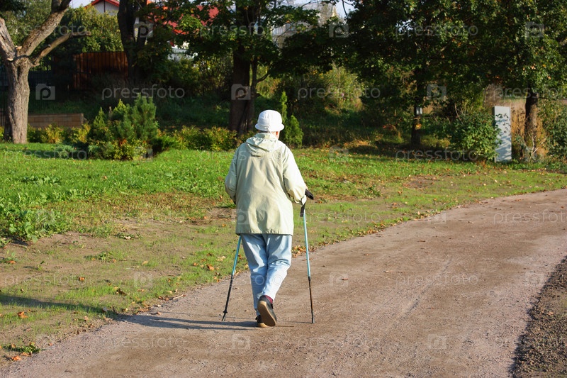 Пожилая женщина занимается скандинавским ходьбой в парке