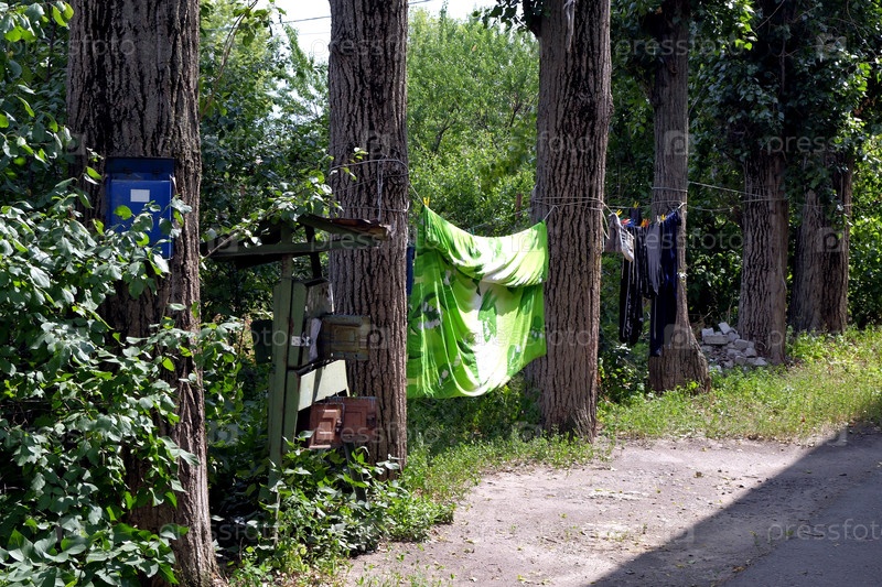 Сушка белья на веревке между стволами тополей.Россия, Воронежская область, 15 июля 2025