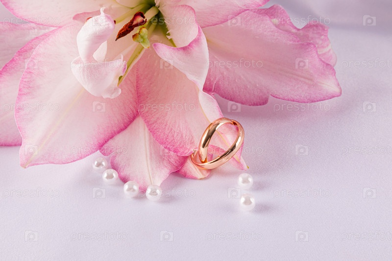 Два классических золотых обручальных кольца на белом атласном фоне с жемчужинами и красивым розовым лилием. свадебная открытка, приглашение