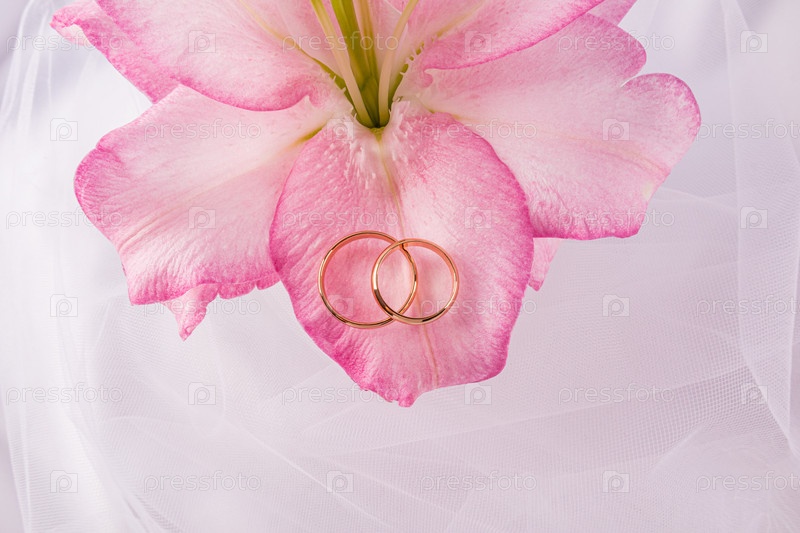 Пара золотых классических колец лежит на нежном розовом лилье. свадебная концепция. оформление дизайна открытки, приглашение. пространство для копирования
