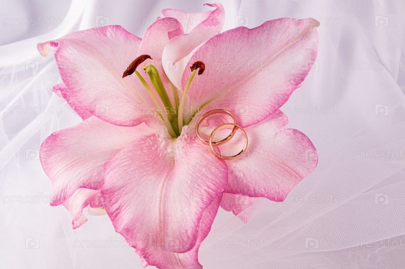 Пара золотых классических колец лежит на нежном розовом лилье. свадебная концепция. оформление дизайна открытки, приглашение. вид сверху