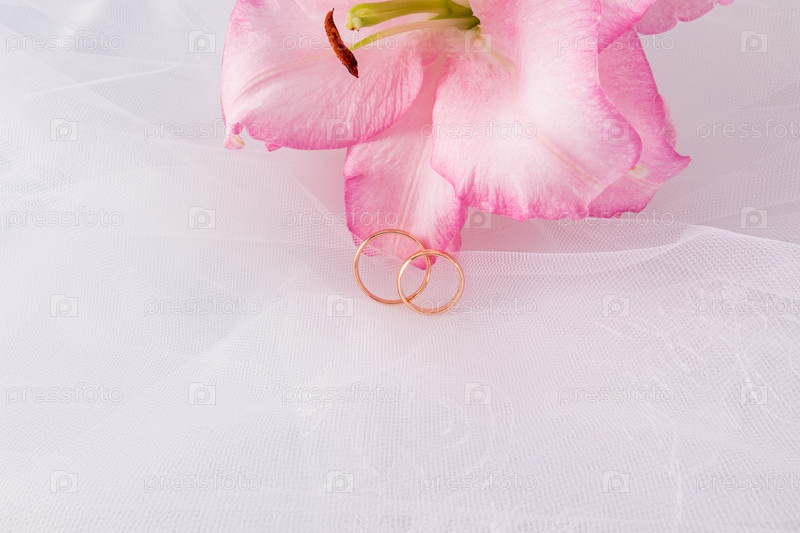 Два золотых обручальных кольца лежат на лепестке нежной цветочной лилии. завеса белого фона. пространство для копирования. концепция карты, приглашения