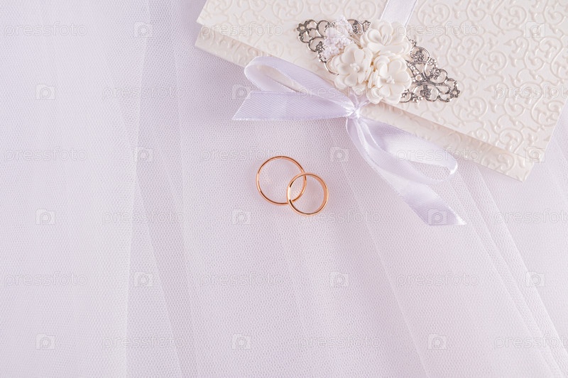 Два золотых обручальных кольца лежат между мягкими складками белой завесы невесты рядом с красивым конвертом для свадебных приглашений