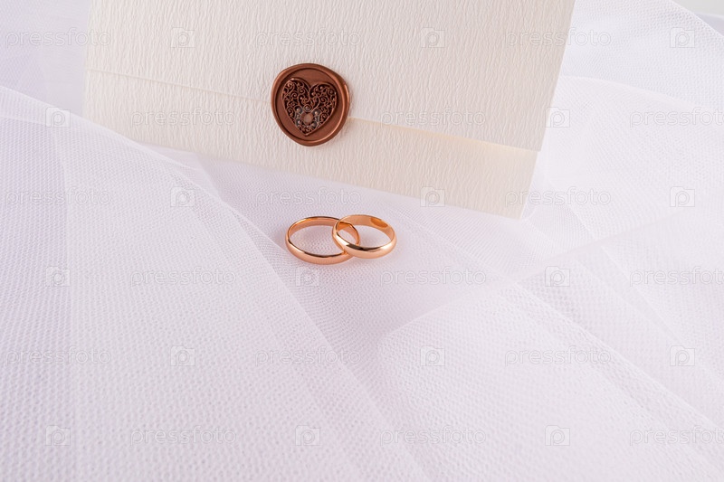 Шикарный свадебный конверт с сердцем и двумя золотыми обручальными кольцами на белом фоне невесты