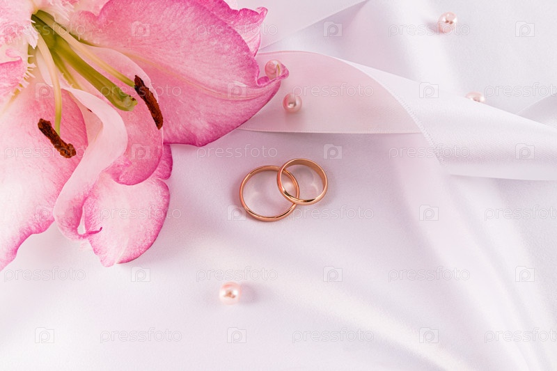 Два классических золотых обручальных кольца на белом атласном фоне с жемчужинами и красивым розовым лилием. свадебная открытка, приглашение