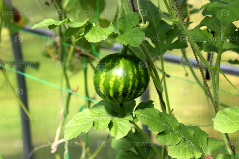 Небольшой круглый полосатый плод арбуза созревает на солнце в теплице среди листьев цветущей вертикальной дыни