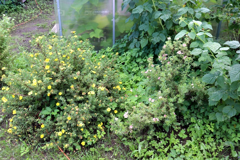 Цветущие кустарники желтой и розовой лапчатки рядом с теплицей и малиновые кусты в саду летом
