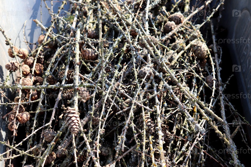 Сухие сосновые ветви с конусами на солнце в садовой тележке