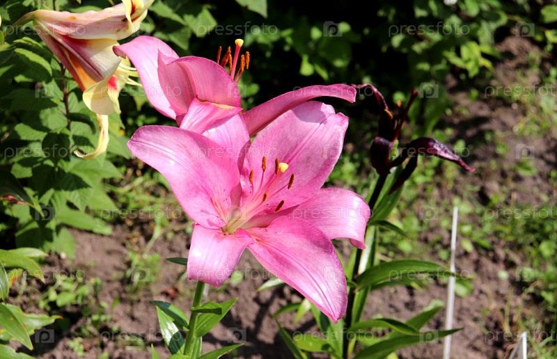 Две розово-фиолетовые лилии на лилейном кусте в клумбе среди других лилий в саду в солнечный летний день