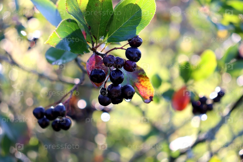 Кусок спелой аронии из черного фрукта с капельками на ягодах после дождя в полутени на ветке в саду