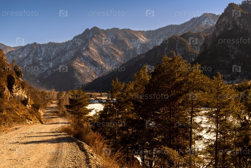 Извилистая грунтовая дорога через горный пейзаж с сосновыми деревьями и частично замерзшей рекой
