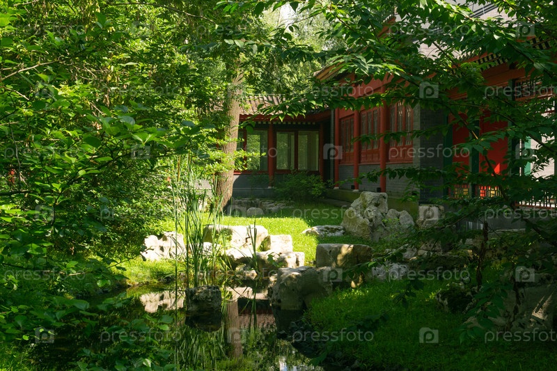 Китайский сад с красным павильоном, окруженный зеленью