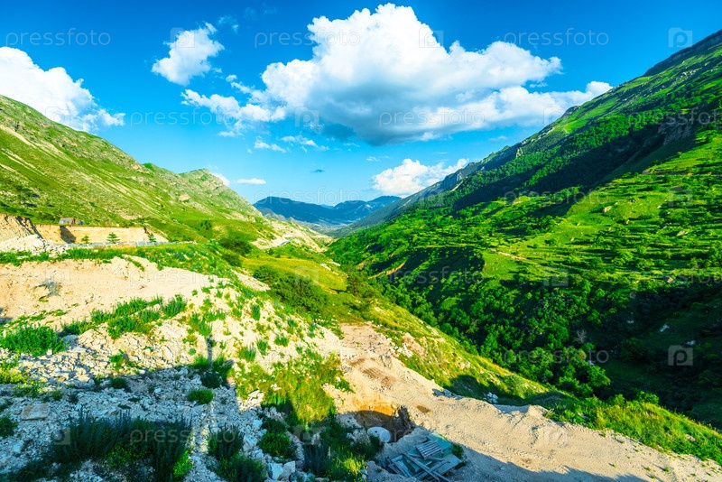 Прекрасный вид на облака над зеленым горным каньоном в горах Северного Кавказа