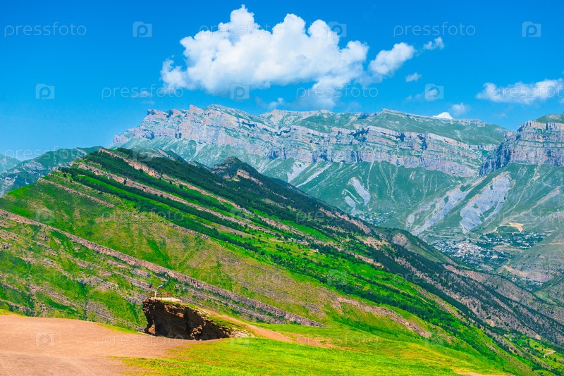 Живописный пейзаж с зелеными горными слоями в горах Северного Кавказа