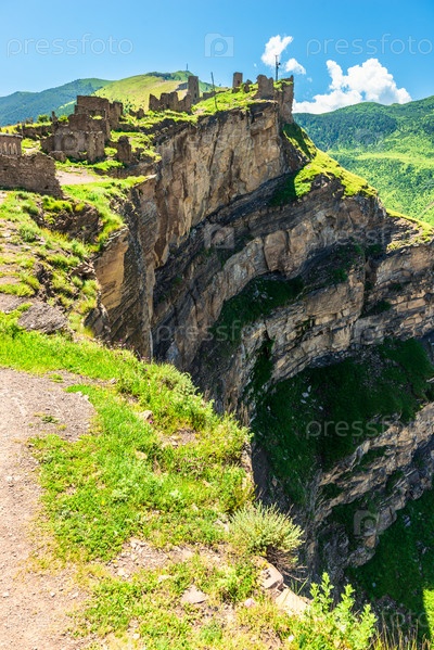 Драматический вид руин горной деревни Гор над пропастью глубокого горного ущелья на Северном Кавказе
