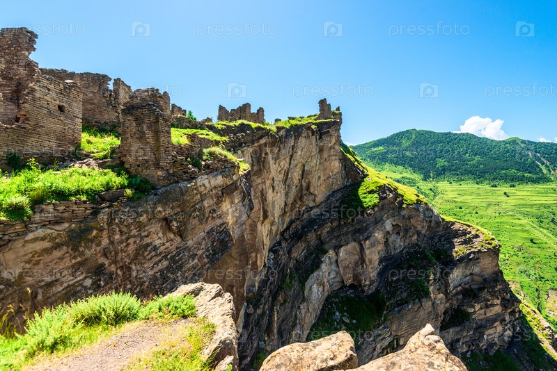 Драматический вид руин горной деревни Гор над пропастью глубокого горного ущелья на Северном Кавказе