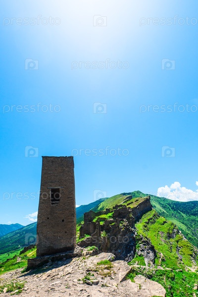 Живописный горный пейзаж с руинами древних башен на крутой скале