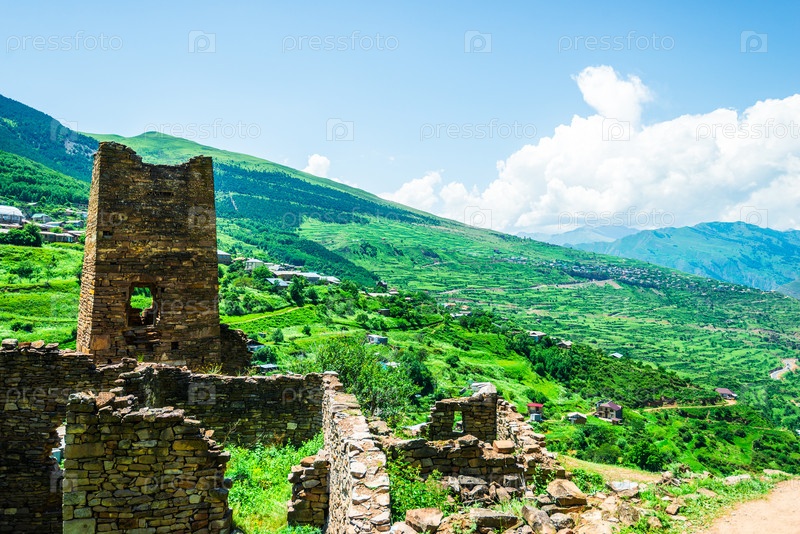 Старая сторожевая башня среди руин заброшенной горной деревни Кахиб на склоне горы