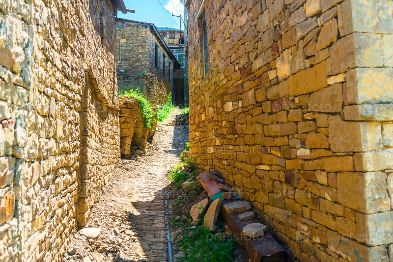 Древние каменные стены в старой переулке древней горной деревни