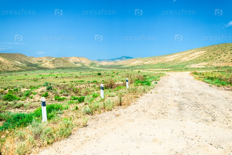 Живописный пейзаж на сельской грунтовой дороге в полупустыне гор Северного Кавказа