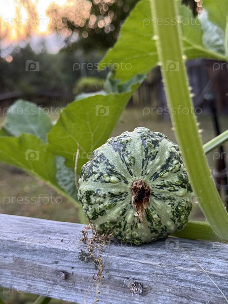Маленькая декоративная тыква. зеленая. выращивается в саду. близко