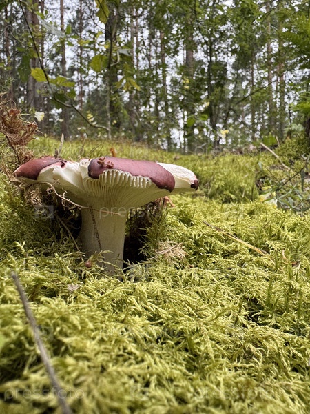 Руссула рвотный гриб. он растет в лесу среди мхов. стрельба на уровне земли