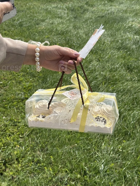 Женщина держит в руке зеленоватое блюдо из коробки с подарками на фоне зелёной травы