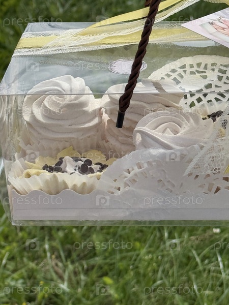 Фрагмент подарочной коробки с зефиром. Коробка с прозрачным крышкой. Закрыть