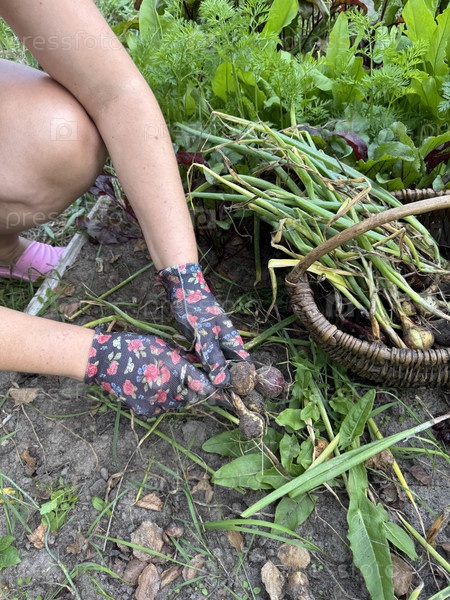 Женщина вытаскивает лук из садовой кровати, он держит кусок собранных луков