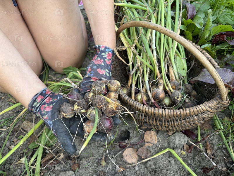 Женщина вытаскивает лук из садовой кровати. он держит кусок собранных луков. урожай в заднем дворе сада. закрытие