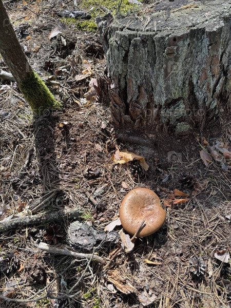 Коричневые грибы растут в лесу. среди упавших листьев и сосновых игл. возле сосновой конопли. высокоугольные снимки
