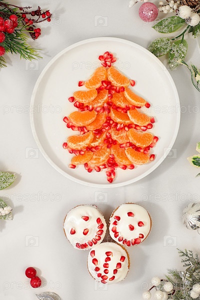Рождественские и новогодние блюда. съедобная рождественская елка из мандаринов и граната для праздничного стола, идея для украшения еды и декорирования новогодних блюд для детей. баннер