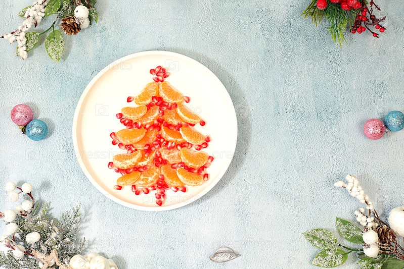 Съедобная рождественская елка из мандарин и граната для праздничного стола, идея украшения еды и декорирования новогодних блюд для детей