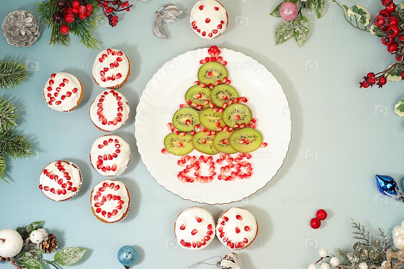 Сырные кексы с гранатами в глазуре с номерами 2026 и киви на праздничный стол, идея для украшения еды и декорирования новогодних блюд для детей